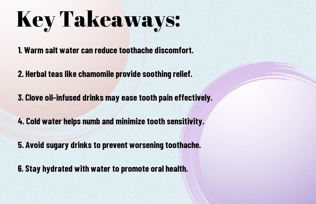 Most individuals experiencing a toothache seek immediate relief and wonder what drink can ease their discomfort. While staying hydrated is crucial, certain beverages can provide additional benefits for your oral health during these painful moments. In this post, you’ll discover effective drink options that may help alleviate your toothache. For further guidance, check out How to Treat Your Toothache at Home — Amy H. See, DDS for comprehensive advice.